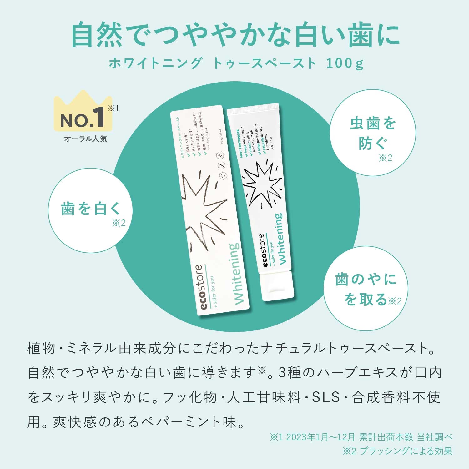 フッ化物・人工甘味料・SLS・合成香料不使用。爽快感のあるペパーミント味。
