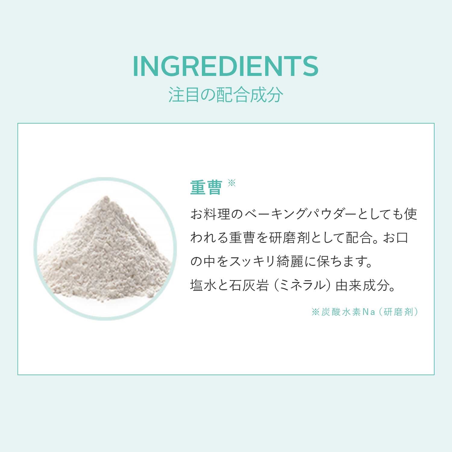 | 成分 | 炭酸Ca*(研磨剤)、グリセリン*(湿潤剤)、水、炭酸水素Na*(研磨剤)※1、キシリトール*(香味剤)、ラウリルグルコシド*(洗浄剤)、カラギーナン*(粘結剤)、セイヨウハッカ油*・スペアミント葉油*・チョウジ葉油*(香味剤)、キサンタンガム*(粘結剤)、マグノリアオフィシナリス樹皮エキス*(保湿剤)・クンゼアエリコイデス葉油*(保存剤)、ステビア葉エキス*(甘味剤)、メントール*(清涼剤)、*植物ミネラル由来成分 |