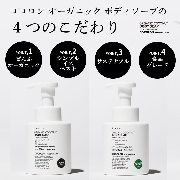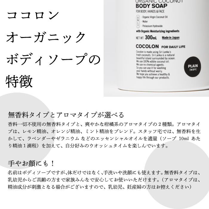 ココナッツオイルの効能、良さを生かしながら、オーガニックグリセリン、オーガニックアロエなどの保湿成分をオリジナルレシピでブレンドしました。香り付きタイプの香料もすべてオーガニック精油を使用。オーガニックレモン、オーガニックマンダリン、オーガニックライムを独自にブレンドし、気持ちが前向きになる爽やかな香りに仕立てました。