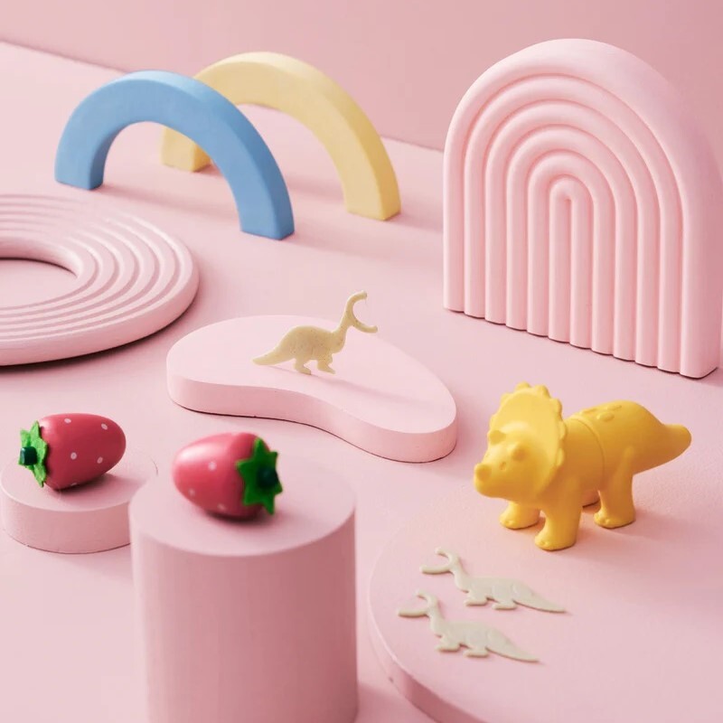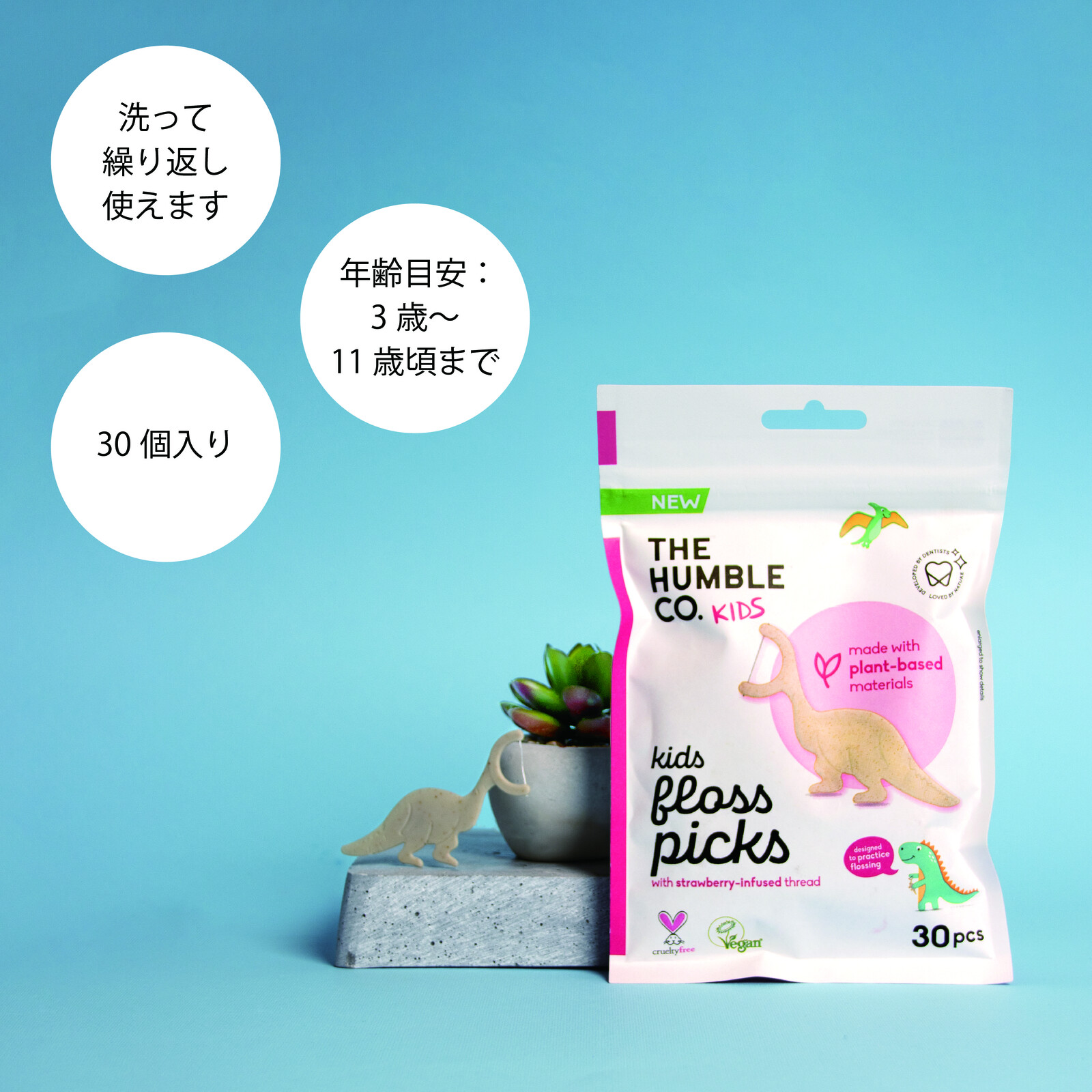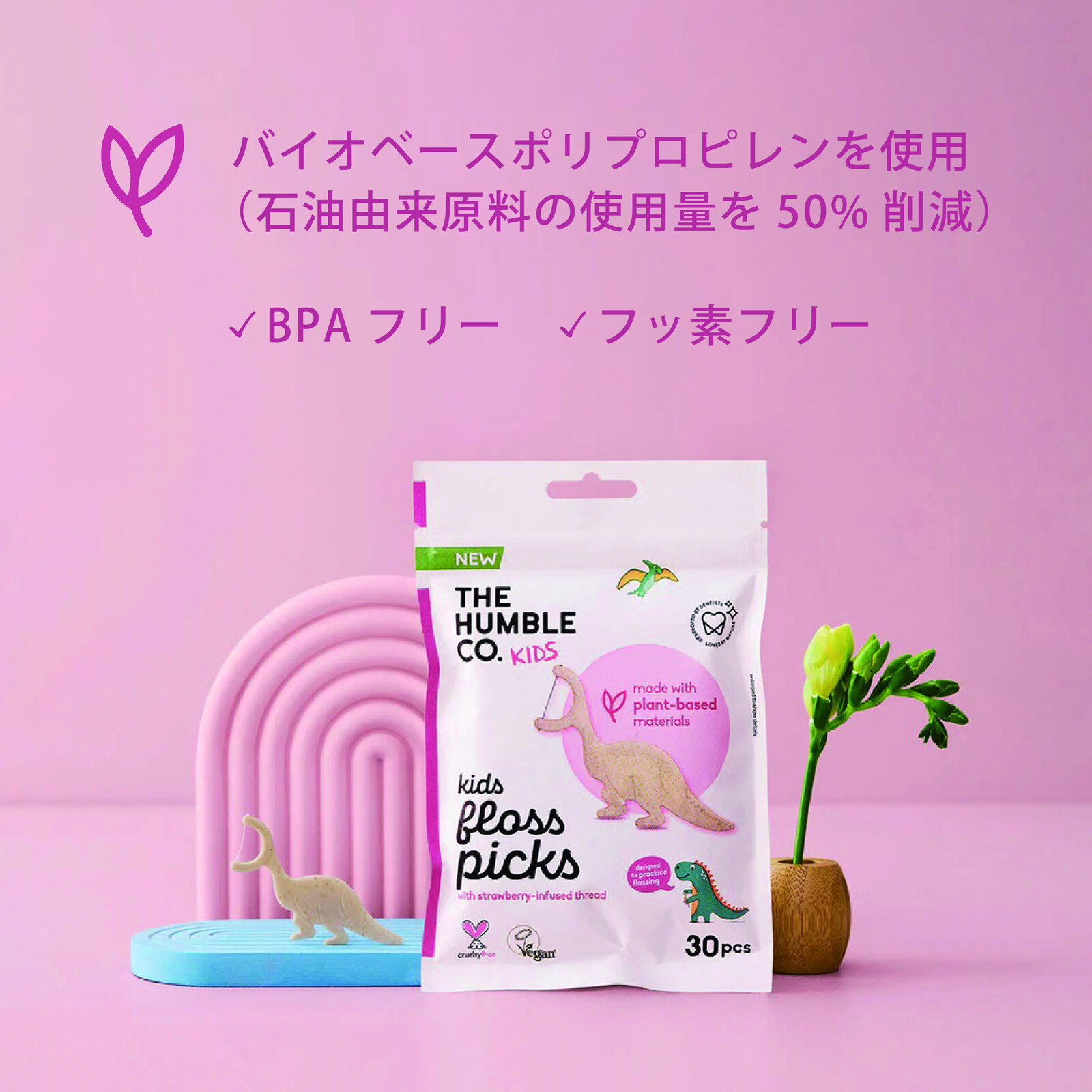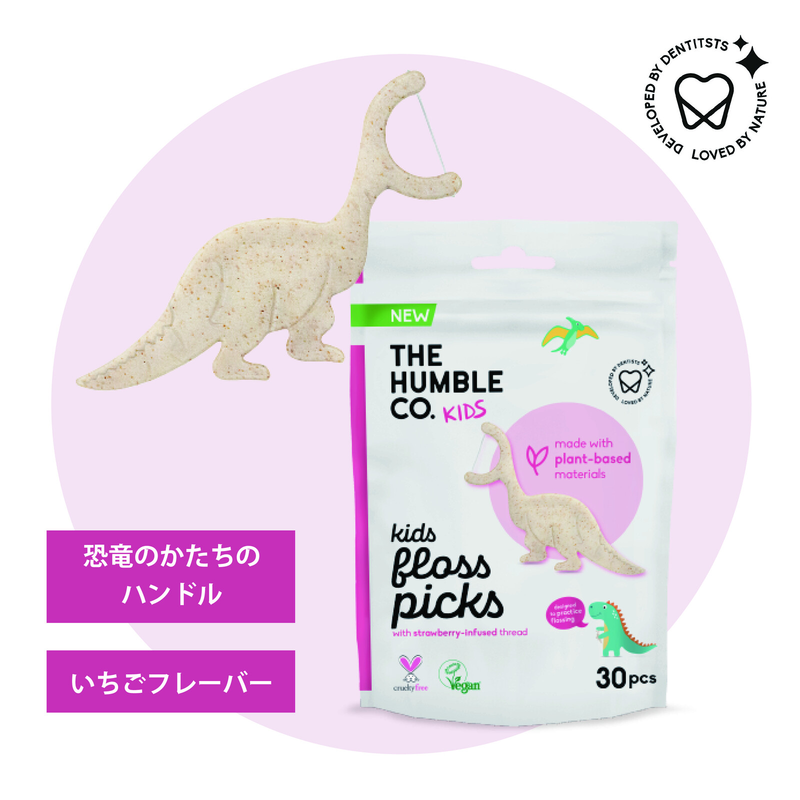 恐竜のかたちのハンドルといちごフレーバーは、子どもが楽しくフロス使用を習慣づけられるように設計されています。