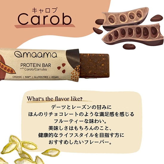 かぼちゃの種子に含まれる植物性たんぱく質をパウダー状にして加えています。キャロブは、マメ科の植物で、大きなさやの中に果肉部分の実は甘味が強く、ほんのりとした苦みがチョコレートやココアの代用品として注目を浴びるスーパーフードです。
